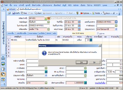 เมื่อบันทึกรับสินค้าโดยการใส่รหัสสินค้า และระบุปริมาณแล้วโปรแกรมก็จะเตือนให้ผู้ใช้กำหนด Serial Number ทันทีดังรูป ทั้งนี้ก็เพื่อป้องกันให้ไม่ลืมกำหนด Serial Number แต่ถ้าลืมกำหนดเมื่อกดบันทึกข้อมูลโปรแกรมก็จะเตือนอีกครั้ง ถ้าใส่ Serial Number ไม่ครบหรือไม่ได้ใส่