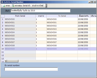 หน้าจอรับ Serial Numer โดยสามารถรับเป็นช่วงโดยการคีย์เข้าไป หรือ สามารถรับโดยการยิง Serial Number ที่ละรายการก็ทำได้ หรือสามารถนำเข้าข้อมูลจาก Text File ที่ได้จากการเครื่อง Handhelp ก็สามารถทำได้เช่นกันเพื่อให้เกิดความถูกต้อง รวดเร็วยิ่งขึ้น